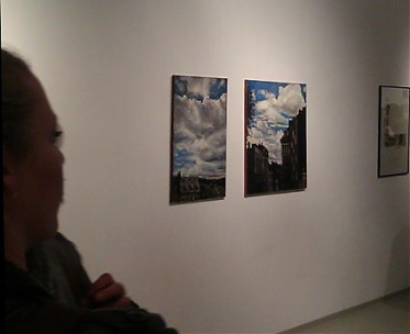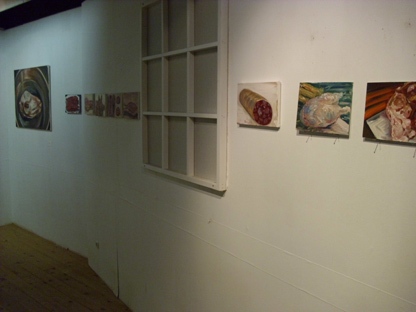 Gemäldecollagen, Fleischbilder, Schönheiten, Aktzeichnungen füllten den Raum. Das Atelier erschien durch die Auslagerung einiger Bilder etwas luftiger.
