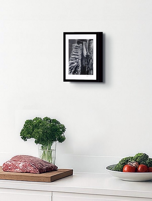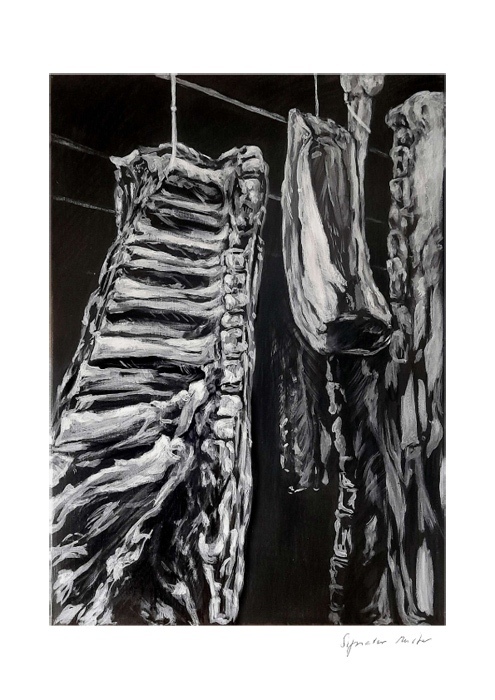 Die Fleischgemälde haben ihren Ursprung in meiner Koch- und Essleidenschaft. Nach einem Auftrag für ein Stilleben im Jahr 2007 malte ich mein damaliges Lieblingsessen: Perlhuhn bardiert mit Bauchspeck. Dieses Motiv ließ sich besonders gut darstellen, weil sich die Leidenschaften Malerei, Kochen und Essen ergänzten. Von da an war Fleisch das bestimmende Bild-Thema und 2025 beschloss ich, nur noch Fleisch abzubilden. Fleisch zu malen fasziniert und berührt mich in vielfältiger Hinsicht. Folgende Aspekte sind mir dabei wichtig: Die erdende Wirkung des Kochens und Essens, die Ehrlichkeit, Kindheitserinnerungen, das Archaische, die Üppigkeit der Renaissance.
