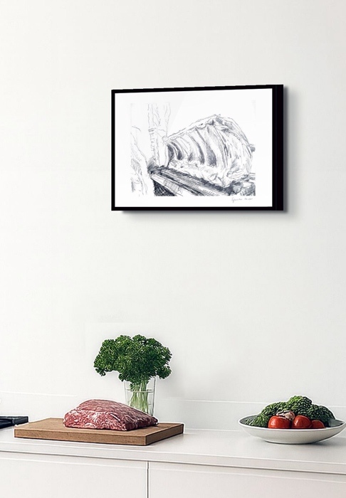 Die Fleischgemälde haben ihren Ursprung in meiner Koch- und Essleidenschaft. Nach einem Auftrag für ein Stilleben im Jahr 2007 malte ich mein damaliges Lieblingsessen: Perlhuhn bardiert mit Bauchspeck. Dieses Motiv ließ sich besonders gut darstellen, weil sich die Leidenschaften Malerei, Kochen und Essen ergänzten. Von da an war Fleisch das bestimmende Bild-Thema und 2025 beschloss ich, nur noch Fleisch abzubilden. Fleisch zu malen fasziniert und berührt mich in vielfältiger Hinsicht. Folgende Aspekte sind mir dabei wichtig: Die erdende Wirkung des Kochens und Essens, die Ehrlichkeit, Kindheitserinnerungen, das Archaische, die Üppigkeit der Renaissance.