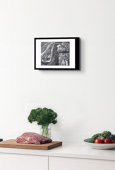 Die Fleischgemälde haben ihren Ursprung in meiner Koch- und Essleidenschaft. Nach einem Auftrag für ein Stilleben im Jahr 2007 malte ich mein damaliges Lieblingsessen: Perlhuhn bardiert mit Bauchspeck. Dieses Motiv ließ sich besonders gut darstellen, weil sich die Leidenschaften Malerei, Kochen und Essen ergänzten. Von da an war Fleisch das bestimmende Bild-Thema und 2025 beschloss ich, nur noch Fleisch abzubilden. Fleisch zu malen fasziniert und berührt mich in vielfältiger Hinsicht. Folgende Aspekte sind mir dabei wichtig: Die erdende Wirkung des Kochens und Essens, die Ehrlichkeit, Kindheitserinnerungen, das Archaische, die Üppigkeit der Renaissance.