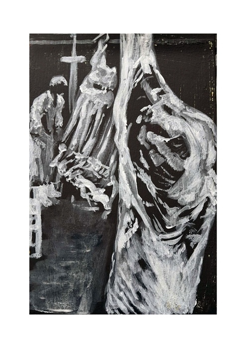Die Fleischgemälde haben ihren Ursprung in meiner Koch- und Essleidenschaft. Nach einem Auftrag für ein Stilleben im Jahr 2007 malte ich mein damaliges Lieblingsessen: Perlhuhn bardiert mit Bauchspeck. Dieses Motiv ließ sich besonders gut darstellen, weil sich die Leidenschaften Malerei, Kochen und Essen ergänzten. Von da an war Fleisch das bestimmende Bild-Thema und 2025 beschloss ich, nur noch Fleisch abzubilden. Fleisch zu malen fasziniert und berührt mich in vielfältiger Hinsicht. Folgende Aspekte sind mir dabei wichtig: Die erdende Wirkung des Kochens und Essens, die Ehrlichkeit, Kindheitserinnerungen, das Archaische, die Üppigkeit der Renaissance.