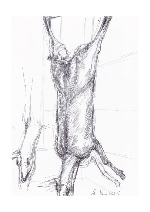 Die Fleischgemälde haben ihren Ursprung in meiner Koch- und Essleidenschaft. Nach einem Auftrag für ein Stilleben im Jahr 2007 malte ich mein damaliges Lieblingsessen: Perlhuhn bardiert mit Bauchspeck. Dieses Motiv ließ sich besonders gut darstellen, weil sich die Leidenschaften Malerei, Kochen und Essen ergänzten. Von da an war Fleisch das bestimmende Bild-Thema und 2025 beschloss ich, nur noch Fleisch abzubilden. Fleisch zu malen fasziniert und berührt mich in vielfältiger Hinsicht. Folgende Aspekte sind mir dabei wichtig: Die erdende Wirkung des Kochens und Essens, die Ehrlichkeit, Kindheitserinnerungen, das Archaische, die Üppigkeit der Renaissance.