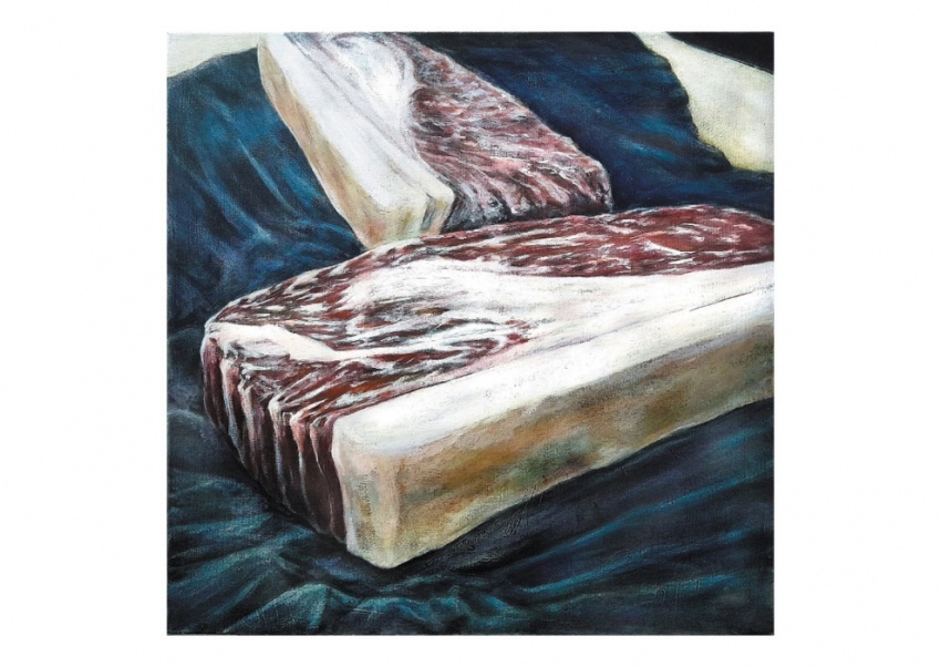 Dieses Bild ehrt die beiden edlen Fleischstücke. Deshalb liegen sie auf einem vornehmen, blauen Stofftuch, welches an ein altmeisterliches Stilleben erinnert. Diese Wirkung unterstreicht auch die Lasurmalerei, eine Renaissance-Maltechnik.