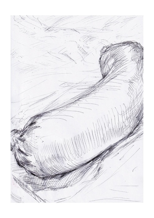 In der Zeichung Fleischwurst linear (Kugelschreiber auf Papier, 21 x 30 cm, 2025) habe ich versucht, den schlichten Genuss einer Wurst, bei der man aufpassen muss, dass man sie nach anfänglichem Probieren nicht ganz aufisst, in einer einfachen aber prägnanten Zeichnung auszudrücken. Der Zeichenstil wurde dabei von der Schule des französichen Spät-Klassizismus (Jean-Auguste-Dominique Ingres) inspiriert. Er war Lehrmeister von Edgar Degas, meinem ersten Maler-Vorbild.