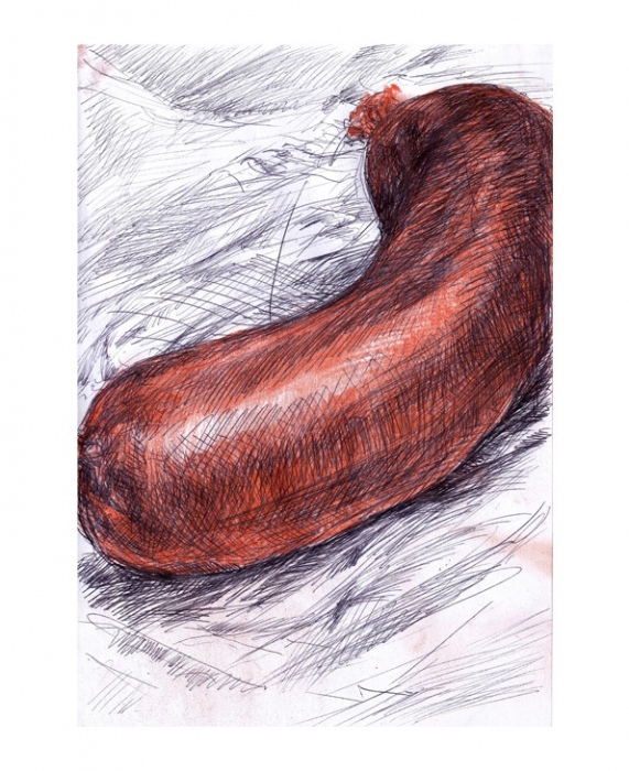In dieser Zeichung habe ich versucht, den schlichten Genuss einer Wurst, bei der man aufpassen muss, dass man sie nach anfänglichem Probieren nicht ganz aufisst, in einer einfachen aber prägnanten Zeichnung auszudrücken. Der Zeichenstil wurde dabei von der Schule des französichen Spät-Klassizismus (Jean-Auguste-Dominique Ingres) inspiriert. Er war Lehrmeister von Edgar Degas, meinem ersten Maler-Vorbild.