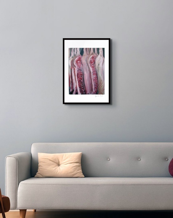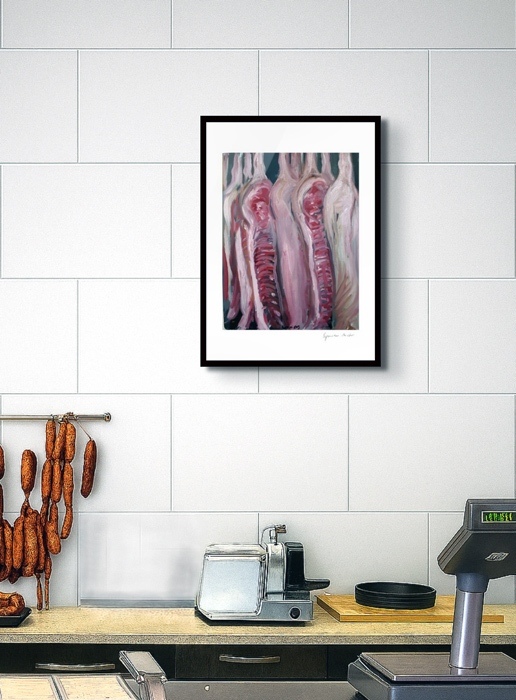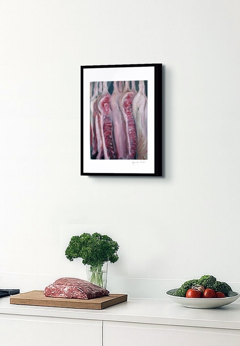 Die Fleischgemälde haben ihren Ursprung in meiner Koch- und Essleidenschaft. Nach einem Auftrag für ein Stilleben im Jahr 2007 malte ich mein damaliges Lieblingsessen: Perlhuhn bardiert mit Bauchspeck. Dieses Motiv ließ sich besonders gut darstellen, weil sich die Leidenschaften Malerei, Kochen und Essen ergänzten. Von da an war Fleisch das bestimmende Bild-Thema und 2025 beschloss ich, nur noch Fleisch abzubilden. Fleisch zu malen fasziniert und berührt mich in vielfältiger Hinsicht. Folgende Aspekte sind mir dabei wichtig: Die erdende Wirkung des Kochens und Essens, die Ehrlichkeit, Kindheitserinnerungen, das Archaische, die Üppigkeit der Renaissance.