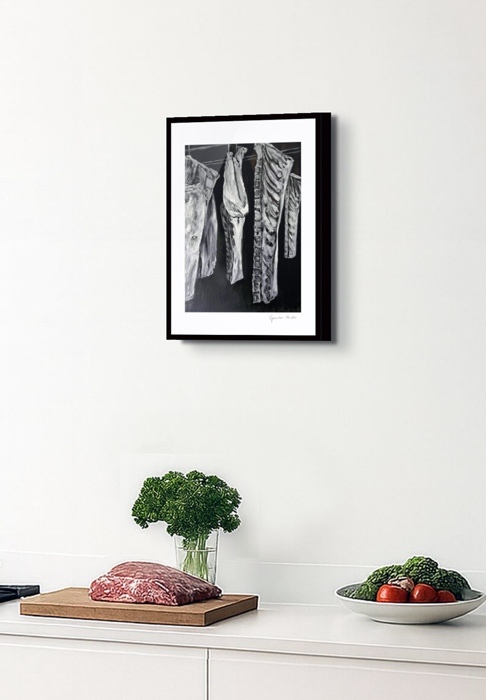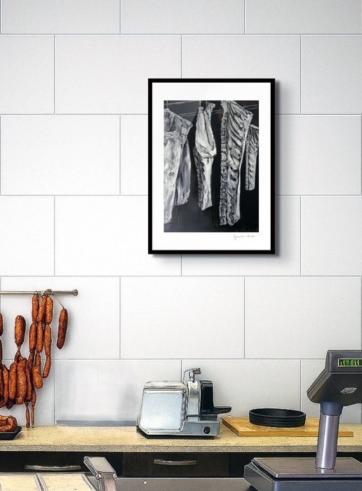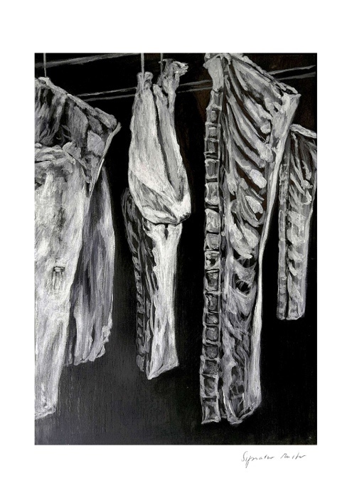 Die Fleischgemälde haben ihren Ursprung in meiner Koch- und Essleidenschaft. Nach einem Auftrag für ein Stilleben im Jahr 2007 malte ich mein damaliges Lieblingsessen: Perlhuhn bardiert mit Bauchspeck. Dieses Motiv ließ sich besonders gut darstellen, weil sich die Leidenschaften Malerei, Kochen und Essen ergänzten. Von da an war Fleisch das bestimmende Bild-Thema und 2025 beschloss ich, nur noch Fleisch abzubilden. Fleisch zu malen fasziniert und berührt mich in vielfältiger Hinsicht. Folgende Aspekte sind mir dabei wichtig: Die erdende Wirkung des Kochens und Essens, die Ehrlichkeit, Kindheitserinnerungen, das Archaische, die Üppigkeit der Renaissance.