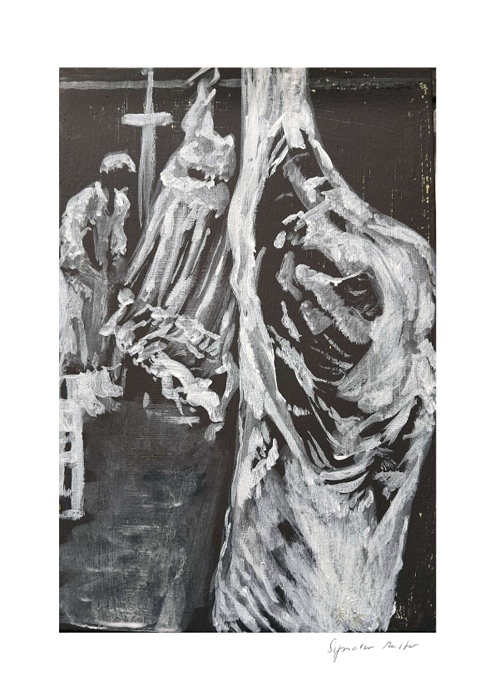Die Fleischgemälde haben ihren Ursprung in meiner Koch- und Essleidenschaft. Nach einem Auftrag für ein Stilleben im Jahr 2007 malte ich mein damaliges Lieblingsessen: Perlhuhn bardiert mit Bauchspeck. Dieses Motiv ließ sich besonders gut darstellen, weil sich die Leidenschaften Malerei, Kochen und Essen ergänzten. Von da an war Fleisch das bestimmende Bild-Thema und 2025 beschloss ich, nur noch Fleisch abzubilden. Fleisch zu malen fasziniert und berührt mich in vielfältiger Hinsicht. Folgende Aspekte sind mir dabei wichtig: Die erdende Wirkung des Kochens und Essens, die Ehrlichkeit, Kindheitserinnerungen, das Archaische, die Üppigkeit der Renaissance.