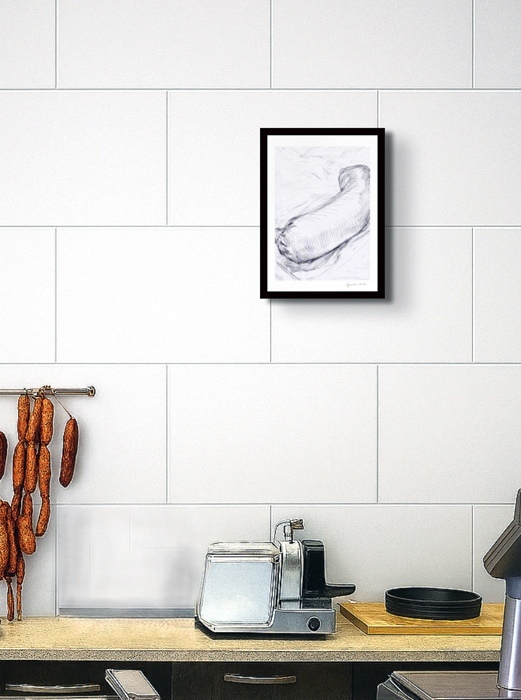 In dieser Zeichung habe ich versucht, den schlichten Genuss einer Wurst, bei der man aufpassen muss, dass man sie nach anfänglichem Probieren nicht ganz aufisst, in einer einfachen aber prägnanten Zeichnung auszudrücken. Der Zeichenstil wurde dabei von der Schule des französichen Spät-Klassizismus (Jean-Auguste-Dominique Ingres) inspiriert. Er war Lehrmeister von Edgar Degas, meinem ersten Maler-Vorbild.