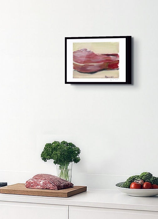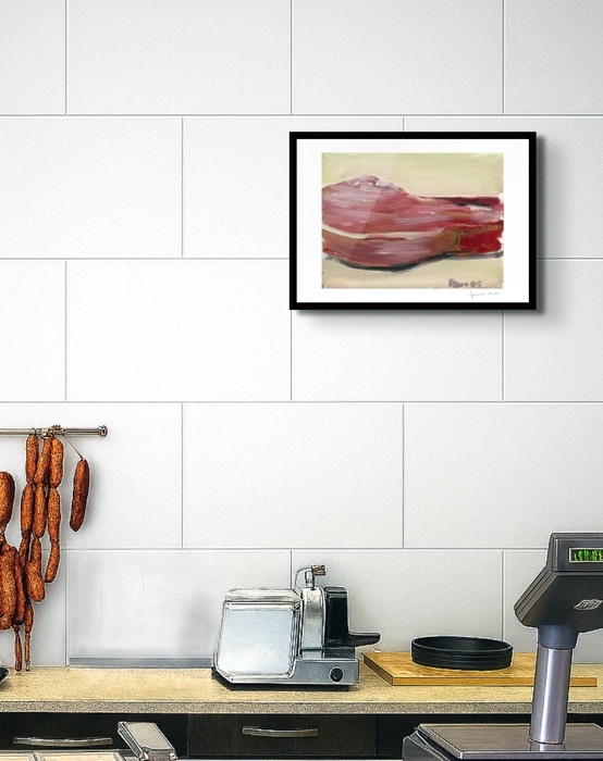 Die Fleischgemälde haben ihren Ursprung in meiner Koch- und Essleidenschaft. Nach einem Auftrag für ein Stilleben im Jahr 2007 malte ich mein damaliges Lieblingsessen: Perlhuhn bardiert mit Bauchspeck. Dieses Motiv ließ sich besonders gut darstellen, weil sich die Leidenschaften Malerei, Kochen und Essen ergänzten. Von da an war Fleisch das bestimmende Bild-Thema und 2025 beschloss ich, nur noch Fleisch abzubilden. Fleisch zu malen fasziniert und berührt mich in vielfältiger Hinsicht. Folgende Aspekte sind mir dabei wichtig: Die erdende Wirkung des Kochens und Essens, die Ehrlichkeit, Kindheitserinnerungen, das Archaische, die Üppigkeit der Renaissance.