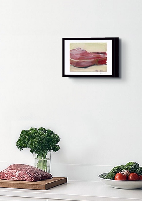 Die Fleischgemälde haben ihren Ursprung in meiner Koch- und Essleidenschaft. Nach einem Auftrag für ein Stilleben im Jahr 2007 malte ich mein damaliges Lieblingsessen: Perlhuhn bardiert mit Bauchspeck. Dieses Motiv ließ sich besonders gut darstellen, weil sich die Leidenschaften Malerei, Kochen und Essen ergänzten. Von da an war Fleisch das bestimmende Bild-Thema und 2025 beschloss ich, nur noch Fleisch abzubilden. Fleisch zu malen fasziniert und berührt mich in vielfältiger Hinsicht. Folgende Aspekte sind mir dabei wichtig: Die erdende Wirkung des Kochens und Essens, die Ehrlichkeit, Kindheitserinnerungen, das Archaische, die Üppigkeit der Renaissance.