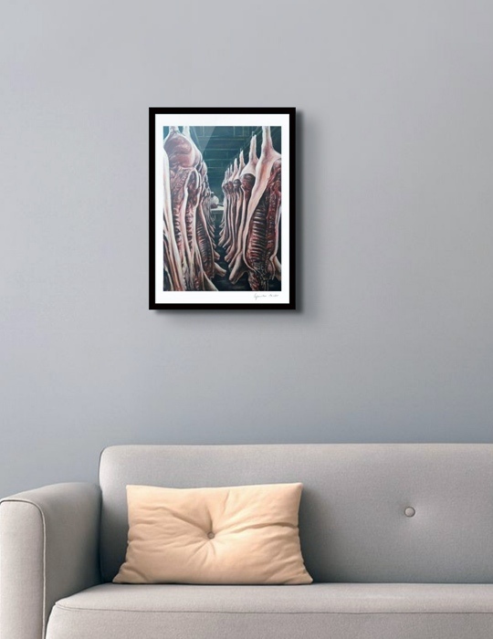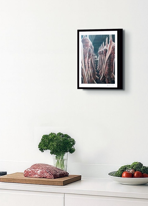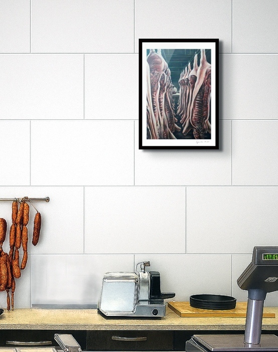 Die Fleischgemälde haben ihren Ursprung in meiner Koch- und Essleidenschaft. Nach einem Auftrag für ein Stilleben im Jahr 2007 malte ich mein damaliges Lieblingsessen: Perlhuhn bardiert mit Bauchspeck. Dieses Motiv ließ sich besonders gut darstellen, weil sich die Leidenschaften Malerei, Kochen und Essen ergänzten. Von da an war Fleisch das bestimmende Bild-Thema und 2025 beschloss ich, nur noch Fleisch abzubilden. Fleisch zu malen fasziniert und berührt mich in vielfältiger Hinsicht. Folgende Aspekte sind mir dabei wichtig: Die erdende Wirkung des Kochens und Essens, die Ehrlichkeit, Kindheitserinnerungen, das Archaische, die Üppigkeit der Renaissance.
