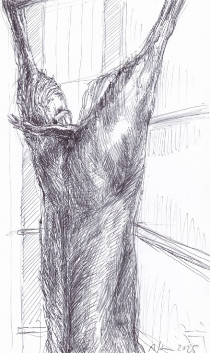 Die Fleischgemälde haben ihren Ursprung in meiner Koch- und Essleidenschaft. Nach einem Auftrag für ein Stilleben im Jahr 2007 malte ich mein damaliges Lieblingsessen: Perlhuhn bardiert mit Bauchspeck. Dieses Motiv ließ sich besonders gut darstellen, weil sich die Leidenschaften Malerei, Kochen und Essen ergänzten. Von da an war Fleisch das bestimmende Bild-Thema und 2025 beschloss ich, nur noch Fleisch abzubilden. Das Sujet fasziniert und berührt mich in vielfältiger Hinsicht. Folgende Aspekte sind dabei wichtig: Die erdende Wirkung des Kochens und Essens, die Ehrlichkeit, Kindheitserinnerungen, das Archaische, die Üppigkeit der Renaissance.