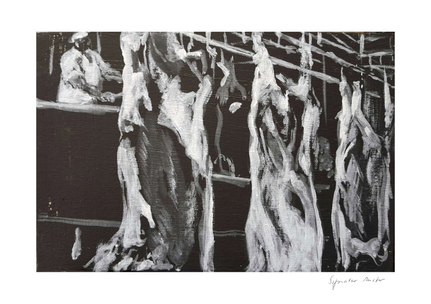 Die Fleischgemälde haben ihren Ursprung in meiner Koch- und Essleidenschaft. Nach einem Auftrag für ein Stilleben im Jahr 2007 malte ich mein damaliges Lieblingsessen: Perlhuhn bardiert mit Bauchspeck. Dieses Motiv ließ sich besonders gut darstellen, weil sich die Leidenschaften Malerei, Kochen und Essen ergänzten. Von da an war Fleisch das bestimmende Bild-Thema und 2025 beschloss ich, nur noch Fleisch abzubilden. Fleisch zu malen fasziniert und berührt mich in vielfältiger Hinsicht. Folgende Aspekte sind mir dabei wichtig: Die erdende Wirkung des Kochens und Essens, die Ehrlichkeit, Kindheitserinnerungen, das Archaische, die Üppigkeit der Renaissance.