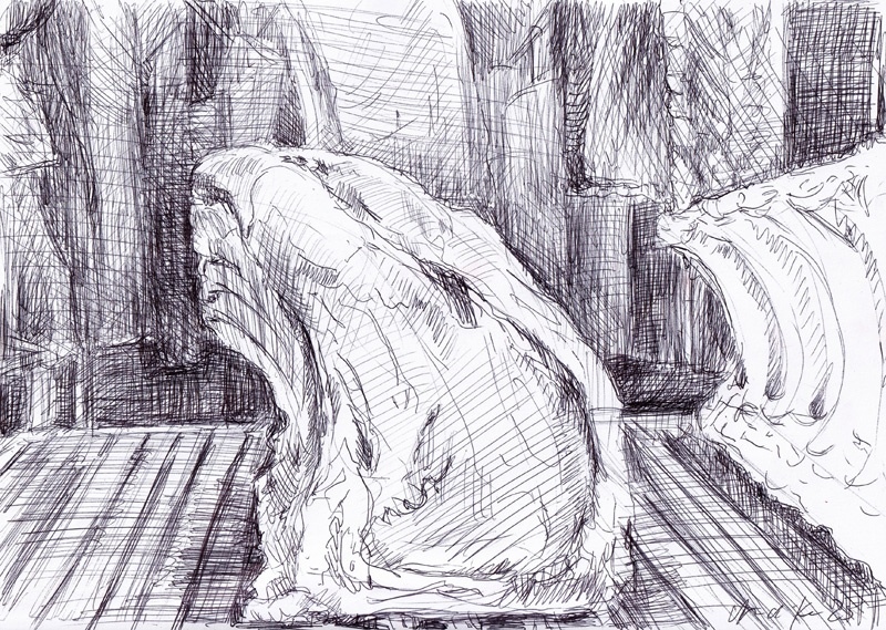 Die Fleischgemälde haben ihren Ursprung in meiner Koch- und Essleidenschaft. Nach einem Auftrag für ein Stilleben im Jahr 2007 malte ich mein damaliges Lieblingsessen: Perlhuhn bardiert mit Bauchspeck. Dieses Motiv ließ sich besonders gut darstellen, weil sich die Leidenschaften Malerei, Kochen und Essen ergänzten. Von da an war Fleisch das bestimmende Bild-Thema und 2025 beschloss ich, nur noch Fleisch abzubilden. Das Sujet fasziniert und berührt mich in vielfältiger Hinsicht. Folgende Aspekte sind dabei wichtig: Die erdende Wirkung des Kochens und Essens, die Ehrlichkeit, Kindheitserinnerungen, das Archaische, die Üppigkeit der Renaissance.